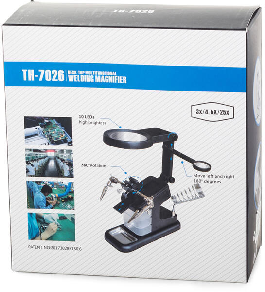 A 3x/4,5x/25x nagyítású professzionális harmadik kéz ideális eszköz a barkácsolás szerelmeseinek. Használhatják ékszerészek, numizmatikusok, elektronikai szerviztechnikusok, órásmesterek stb. Erős krokodilokkal rendelkezik, amelyek szilárdan tartják a munkadarabot, és teljesen állítható ízületekkel a kívánt munkadarab rögzítéséhez. A nagy nagyítóüveg és a 10 x SMD LED-ek segítségével a kép nagyon tiszta és könnyen olvasható. A harmadik kar állítható karral és lencsével rendelkezik, így a megfelelő szögbe állítható. A kiegészítő lencse, szintén függőleges beállítással rendelkezik. A jobb munkakomfort érdekében a nagyító nyitható fiókokkal és egy kivehető fémtálcával is rendelkezik. MŰSZAKI ADATOK: Kiváló minőségű anyagokból készült Kiváló minőségű design 10 SMD LED megvilágítással rendelkezik, amelyek a karon vannak elhelyezve a megvilágítás szögének beállításához. Állítható kar két síkban Tápellátás: 3 x AAA elem (nem tartozék) vagy USB kábelen keresztül A kábel hossza: 69cm A nagyító nagyítása: 3x 75mm; 4,5x 30mm, 25x 20mm Két állítható krokodil karral rendelkezik Spirálos tartóval rendelkezik a forrasztópákákhoz Állítható krokodil beállítással rendelkezik Kivehető fémtálcával rendelkezik 3 nyitható fiókkal rendelkezik különböző apró tárgyak számára ON/OFF kapcsolóval rendelkezik Csúszásmentes lábakkal rendelkezik Alapméretek: 19cm x 8,5cm CE tanúsítvánnyal rendelkezik A KÉSZLET A KÖVETKEZŐKET TARTALMAZZA: Gyári új harmadik kézi nagyító USB kábel Eredeti csomagolás