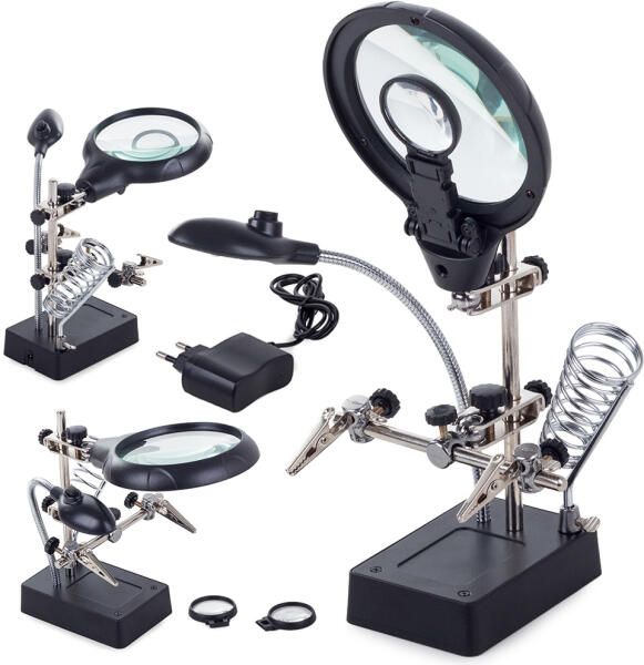 A professzionális harmadik kéz 2,5x 90 mm-es nagyítóval ideális eszköz a barkácsolás szerelmeseinek. Használhatják ékszerészek, numizmatikusok, elektronikai szerviztechnikusok, órásmesterek stb. A nagy nagyítóüvegnek és az 5 x LED-nek köszönhetően a kép nagyon tiszta és könnyen olvasható. Erős krokodilokkal rendelkezik, amelyek szilárdan tartják a munkadarabot, és teljesen állítható ízületekkel a kívánt munkadarab igazításához. Az állványra szerelt nagy nagyító lehetővé teszi a függőleges felemelést és leengedést , emellett forrasztópáka tartóval van felszerelve. A stabil talapzat a forrasztóhegytisztító számára kialakított hellyel biztosítja a stabilitást munka közben. MŰSZAKI ADATOK: Kiváló minőségű anyagokból készült 5 LED-es lámpával rendelkezik, amelyek egy rugalmas karon helyezkednek el a megvilágítás szögének beállításához Tápellátás: 3 x AA elem (nem tartozék) vagy hálózati adapter mellékelve. Tápegység kimeneti feszültsége: feszültség: 5V 1000mA Kábel hossza: 90 cm A nagy nagyító nagyítása: 2,5x 90mm További nagyítók nagyítása: 7,5x 34mm és 10x 34mm Nagy nagyító állványra szerelve, felemelhető és leengedhető. Stabil talapzattal rendelkezik, amely helyet biztosít a páka tisztítónak. Két állítható krokodilkarral rendelkezik Spirális tartóval rendelkezik a forrasztópákákához Alapméretek: 10 cm x 7 cm x 2,5 cm Maximális emelési magasság: 17 cm Súly: 510 A KÉSZLET TARTALMAZZA: Gyári új rögzítőkonzol Nagy nagyítóüveg 2 x további nagyítóüveg tápegység Eredeti csomagolás