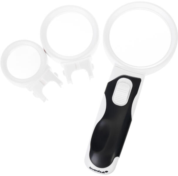 Három nagyító egyben. Cserélhető lencsék és LED világítás. Nagyítás: 3/10/16x