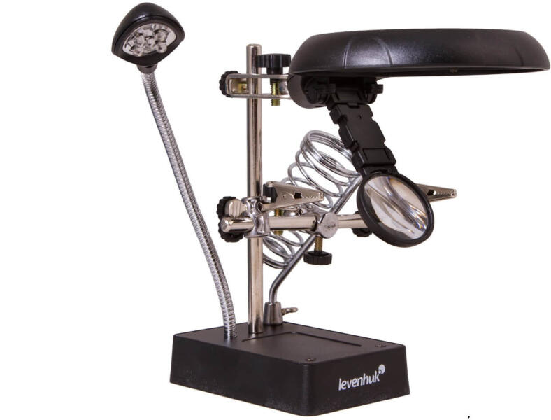 A Levenhuk Zeno Desk D11 nagyító kombinálható lencsékkel, LED-világítással, rugalmas nyakkal, „harmadik kéz eszközzel és egy munkaeszközök számára készült tartóval van felszerelve. Elengedhetetlen segédeszköz mindenkinek, aki aprólékos kézimunkát végez, például ékszerészeknek, villanyszerelőknek, órásmestereknek vagy modellezőknek.