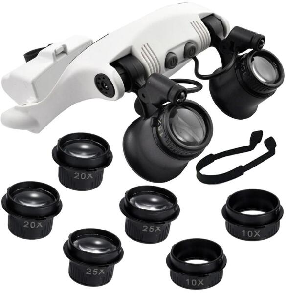 • A készlet 8db  cserélhető lencsét tartalmaz :  2db 25X, 2db 20X, 2db 15X, 2db 10X és egy szilikon pánt a szemüveghez.
